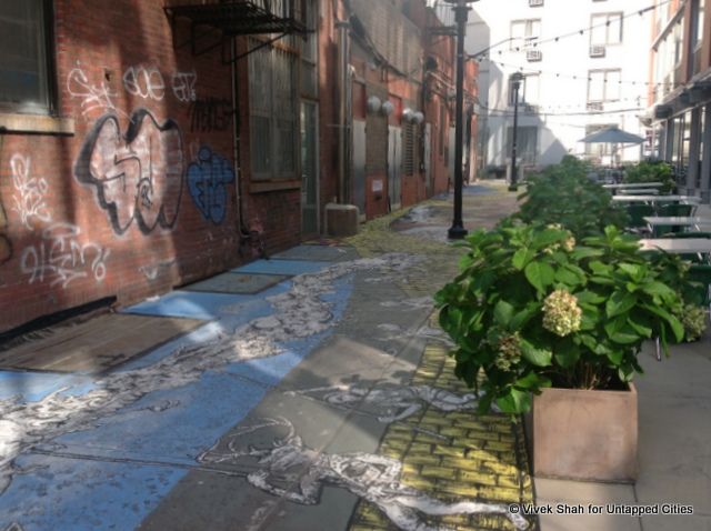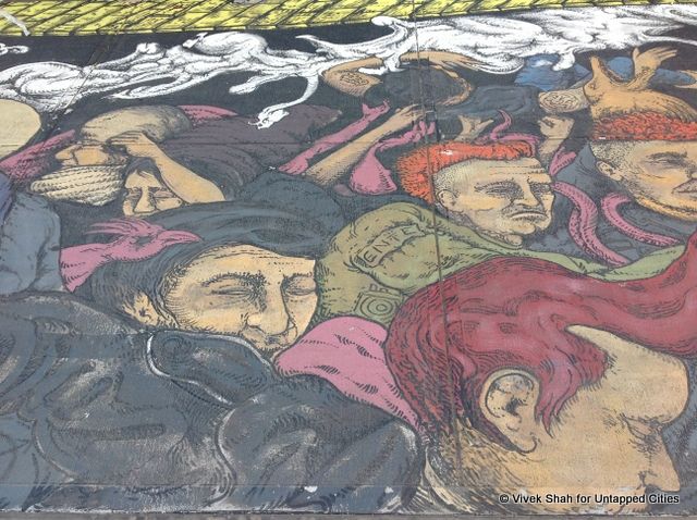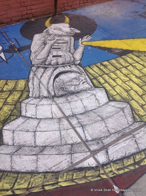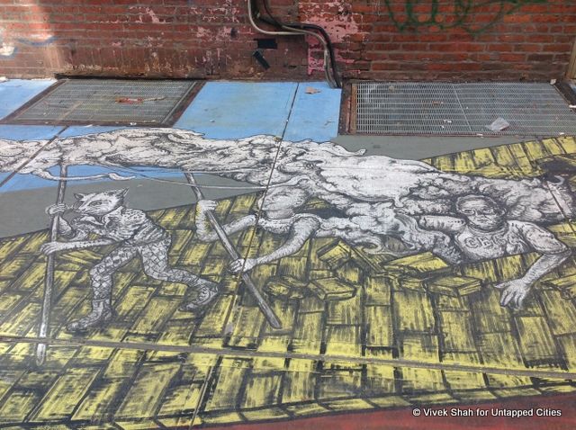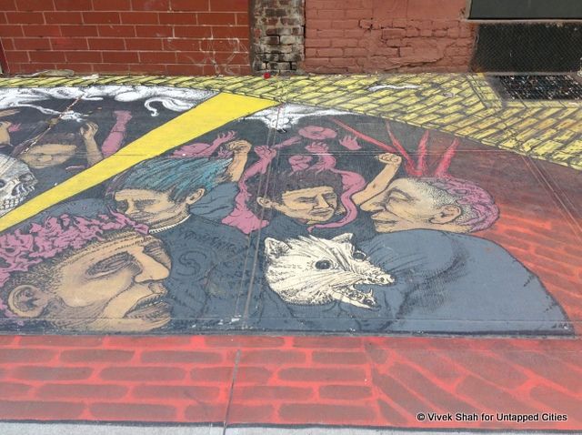 Burgerman’s signature distorted characters and landscapes brighten up the alley with its bold colors. Ellis Gallagher’s piece traces the shadows of fixtures in the alley: pipes, bicycles, and fire escapes- creating permanent shadows that are cast by streetlamps at night, a true symbol of the city. Abe Lincoln Jr’s playful characters mesh a retro comic strip style, and honor the area’s proximity to seminal punk rock palace, the former CBGB.