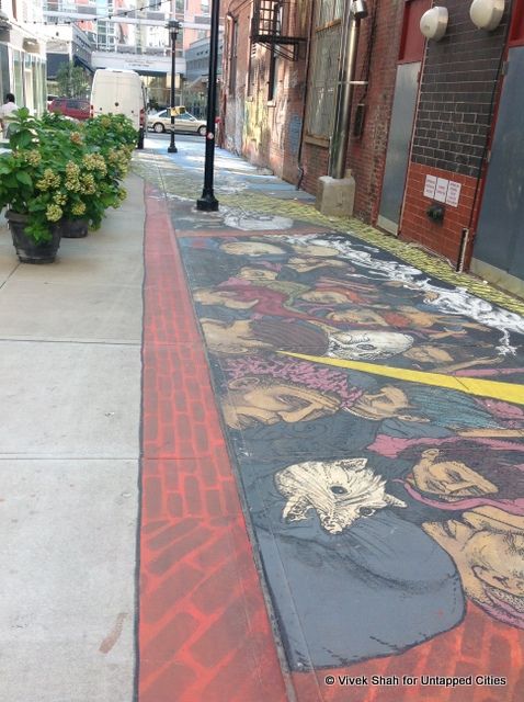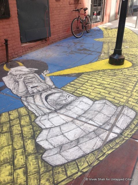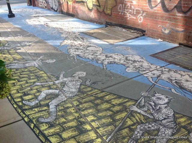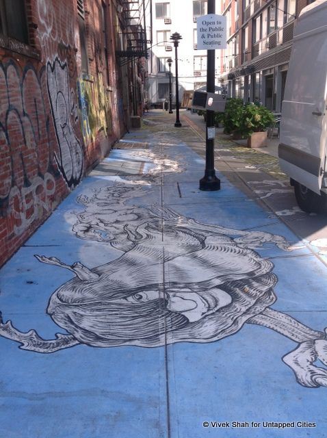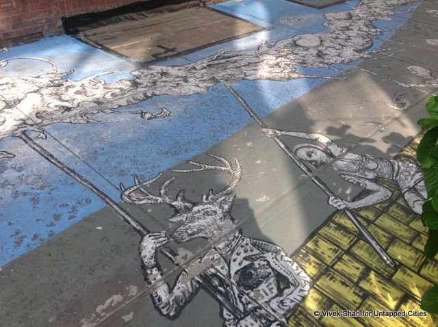 One of our favorite functionally named streets, Extra Place, is now infused with cool street art that’s literally on the street! The ArtUP program by non-profit organization FABnyc animates underutilized spaces in the Lower East Side through art and community partnerships. The current installation features art on the sidewalks by Jon Burgerman, Abe Lincoln Jr. and street artist Ellis Gallagher.