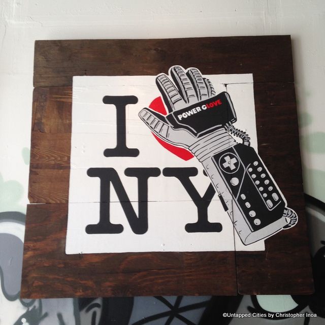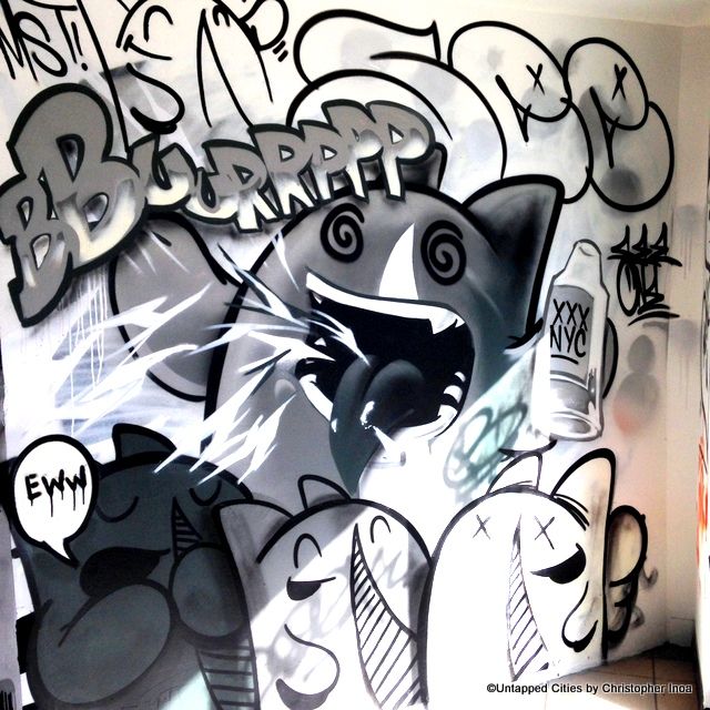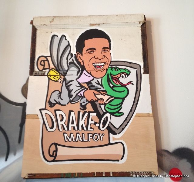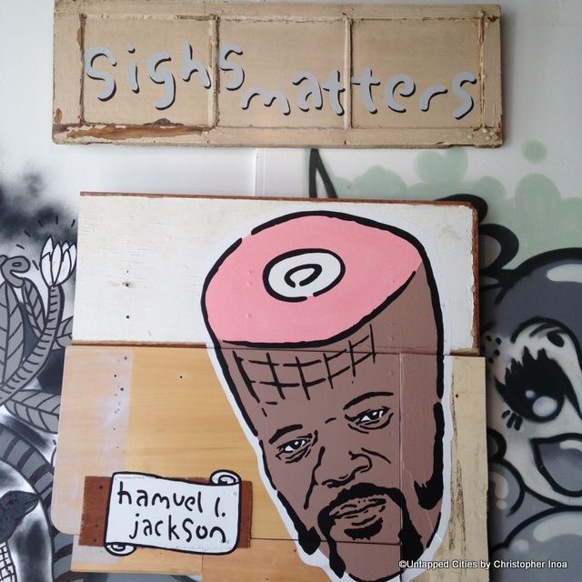 The line to enter the show started to form at 3pm, stretching around the block, with the first 25 people in line getting a package that included three Hanksy prints, and other goodies. The hundred or so others who didn’t leave empty handed. There were chances for art lovers to get their hands on inflatable phallic balloons, or if they brought along their skateboard, they could ride the half pipe built for the event with work from artists Kosby, Elle, Lexi Bella and others. This show, much like Surplus Candy, was promoted as a Hanksy show, however, the unidentified street artist makes it a priority to showcase work from many other NYC street artists. The walls of the space were covered by artists the likes of See One, Frank Ape, Magda Love and others.