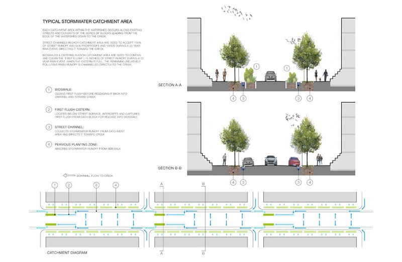 Working with a team of architects and engineers, Atema’s Street Creek concept was tailored for areas such as Gowanus, where streets slope down from higher elevations toward a waterbody. Street Creeks would consist of small trenches cut into roads along the curb line, which stormwater would flow into by gravity and be carried to a waterway or wetland. This would divert stormwater from flowing into the combined sewer system. The water would be filtered through bioswales, which are planted areas specially designed to capture storwmater, a type of green infrastructure the City is already building in some neighborhoods. The concept also includes creating planting strips that would separate the curbs and sidewalks, which would help absorb some stormwater. These features provide the added benefit of greening city streets.