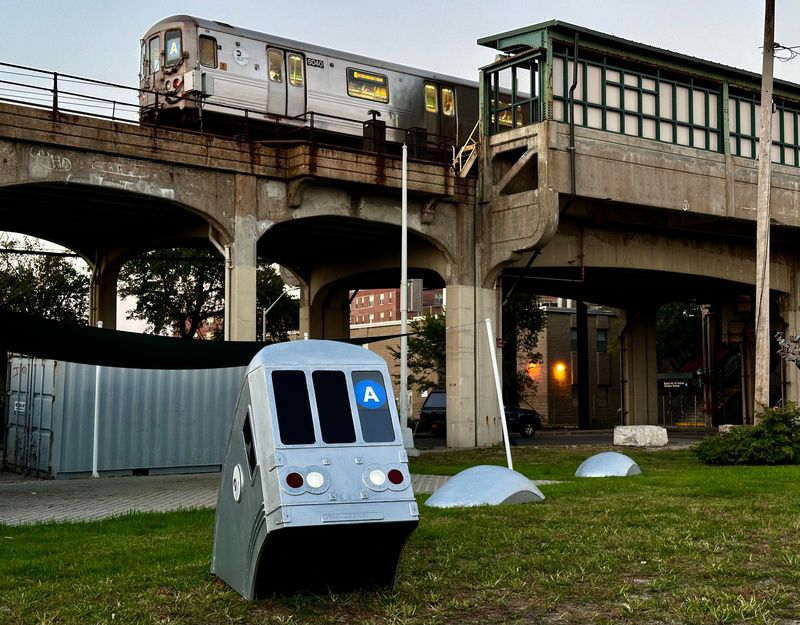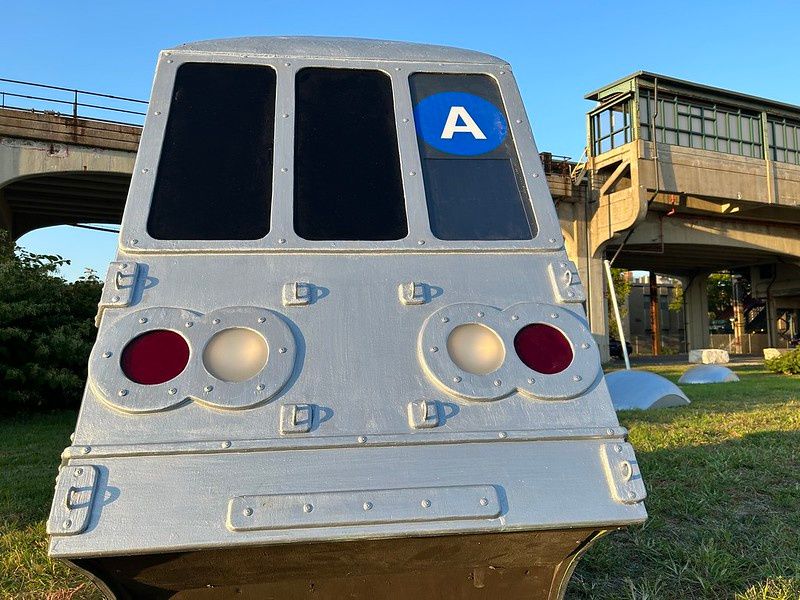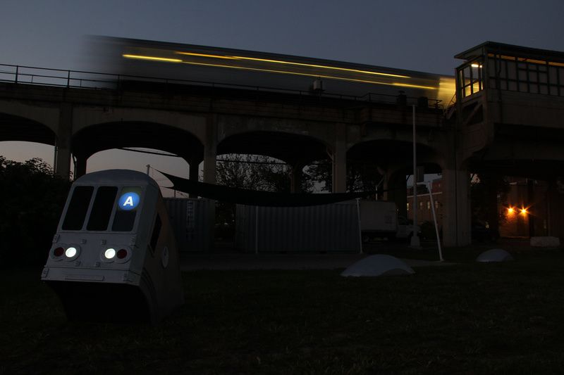This A train twin is made of wood, plaster-resin, and plexiglass coated with a glimmering silver paint. On each side, there is a logo that reads “RTA: Rockaway Subway,” which is reminiscent of the MTA logo. The subway car features a glowing “A” and illuminating headlights powered by a built-in solar panel and battery. These important parts were sourced from local New York City businesses such as Adafruit Industries, a woman-owned, New York City-based electronics manufacturer that focuses on education and the arts, and Voltaic Systems, a Brooklyn-based provider of remote charging solutions.