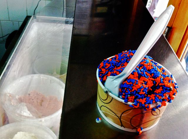 Get a scoop of red bean to start ($3.49). It’s 100% authentic (we’ve mentioned before that many Chinatown shops use red bean paste), and achieves the perfect blend of sweet, creamy, and gritty. The black sesame is a perfect partner (additional scoops are less), and was the biggest surprise for us. Traditionally a dessert soup served hot, the ice cream is loaded with bits of sesame that manage to mix perfectly with the sweet, savory ice cream. Unless you want to join the kids crying over their empty cones and fallen sidewalk heroes, order your scoops in a dish. And for the real New Yorker – top your ice cream with the Knicks-themed sprinkles – called Linsanity, naturally.