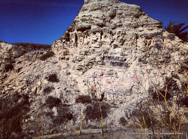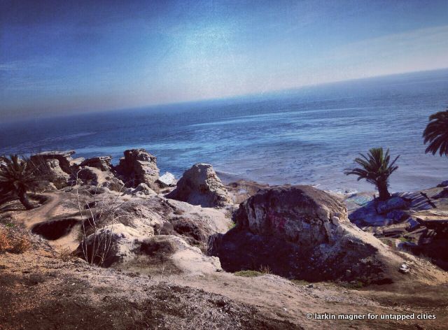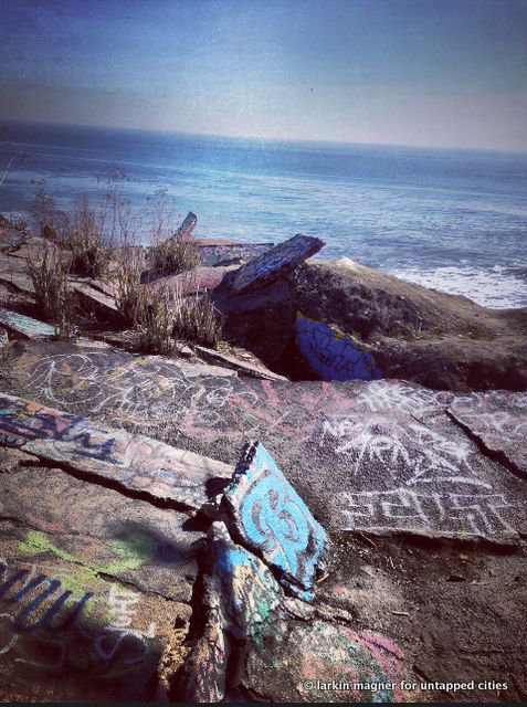 Over eighty years later the cracked and crumbled streets and streetcar tracks are still visible under the graffiti and beer bottles. Palm trees, who unlike humans are fearless of landslides have popped up among the cement slabs. The sound of the waves crashing against the cliffs and seals barking echo against the cement walls of this suburban sinkhole.