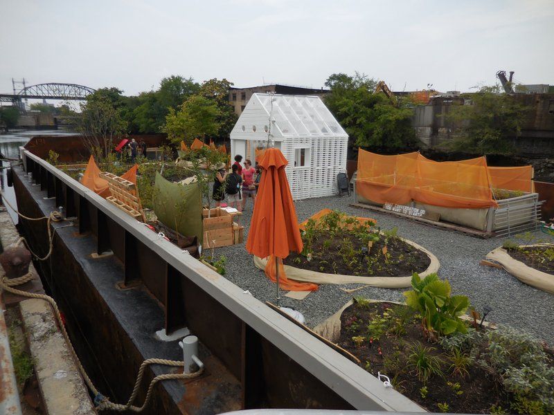 Lined with gravel, Swale has several demarcated growing pods of varying sizes growing different types of vegetables. Some planters accommodate trees, others are for herbs. Swale founder Mary Mattingly tells us, “The planters are made of reused military water bladders. I really wanted to utilize military refuse for this project. The point was to try to transform objects with embedded trauma into something very positive. The beds are all mixed forest garden foods, when they grow to maturity some plants provide shade and nutrients for others.” A white 10 x 12 foot greenhouse, made by the arts group Biome Arts, is the architectural star of the barge, also doubling as a small theater and performance space.