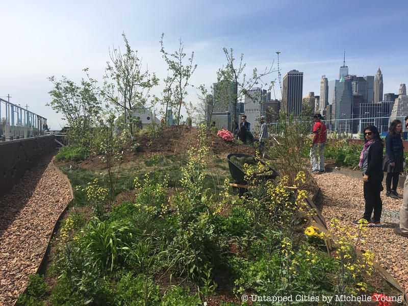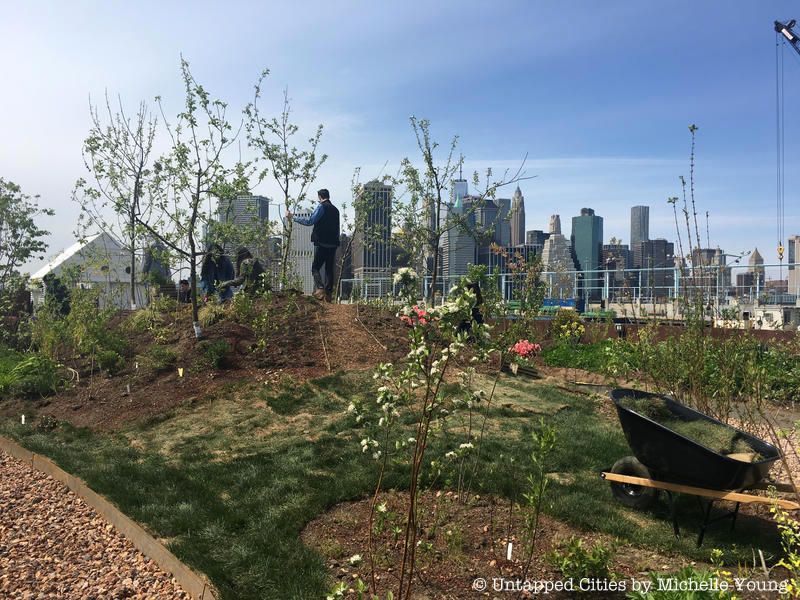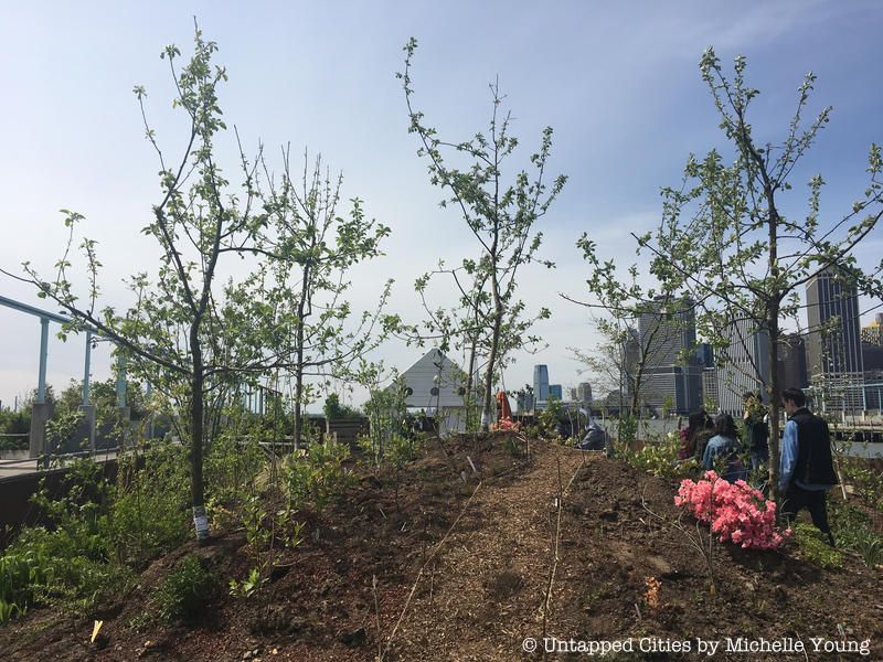 Last year, the vegetables, fruits, and herbs were set up in low planters with walkways around them but this year, the experience is even more naturalistic with a large mound built in partnership with the NYC Department of Parks, which also donated the plants. There are apple trees, blueberry patches, strawberry plants, kale, basil, mint and sage, and medicinal plants. The plants can be watered through a filtration system that takes river water, desalinates it, and filters out the sand and carbon, and stored in several tanks. There is a particular interest in perennial crops that can condition the soil without the need for fertilizers.