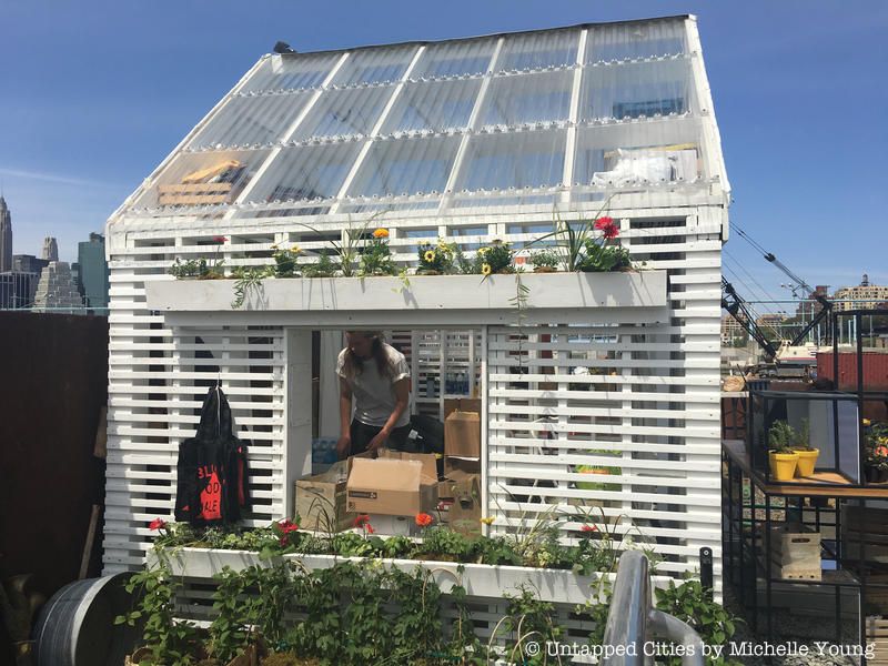 The barge, rented from King Marine, was used to haul sand for construction, and the space within was designed in partnership with a permaculture specialist, scientist and engineer. The engineered hill, which has a small apple grove, was engineered with the help of the NYC Department of Parks and has different layers of gravel, lava rock and soil. A white 10 x 12 foot greenhouse, made by the arts group Biome Arts, is the architectural star of the barge, also doubling as a small theater and performance space.