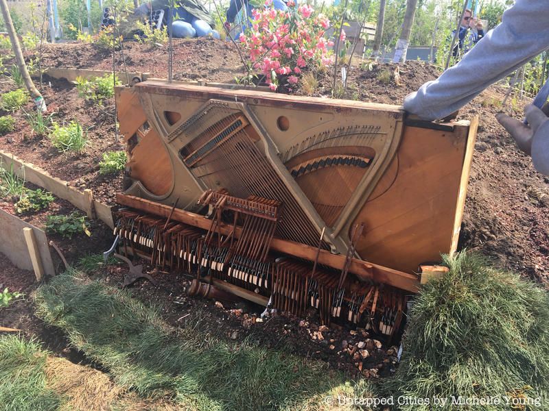 Everything on Swale is also hands on (and feet on), so you can walk on the paths up and around the hill, you can volunteer to help plant – there’s a whole day of gardening on for tomorrow from 12 to 6 PM – and you can take classes and tours aboard the barge. On our visit, Mattingly’s students from Parsons School of Design were helping with the planting and also creating some art installations – look for pieces of a a deconstructed piano.