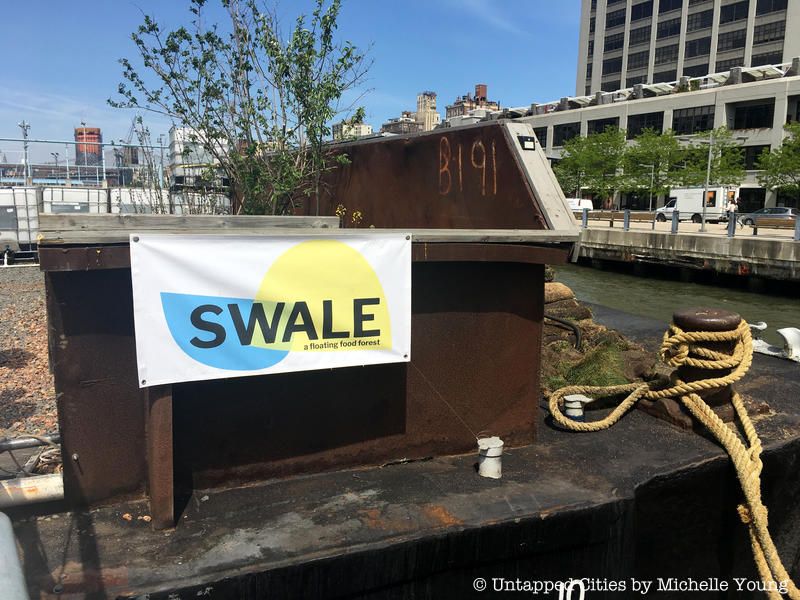 Yesterday, we went to check out Swale, a floating food forest began its second season. Swale, built on a 130 foot by 40 foot deck barge, aims to educate and empower New Yorkers about fresh, healthy food – and the best part is that you can pick the food for free! We walked around the project, currently docked at Pier 6 in Brooklyn Bridge Park, with artist and founder Mary Mattingly. You can watch the visit in our Facebook live video (embedded below), but we’re also including in this article still photographs from the visit.
