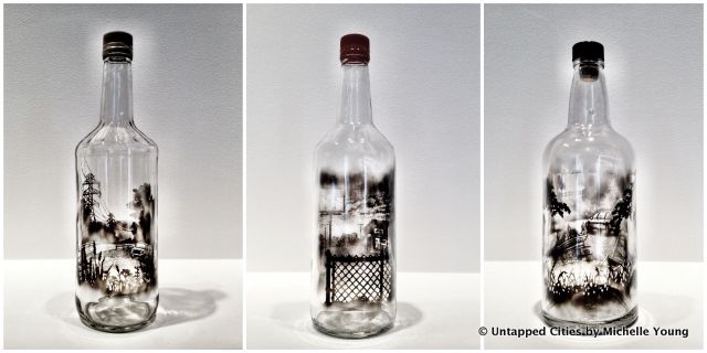 Jim Dingilian coats the inside of empty liquor bottles with smoke, then uses brushes and other small elements to paint these ambiguous yet commonplace suburban scenes