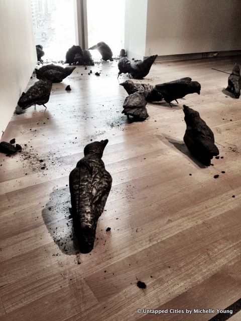 Maskull Lasserre’s “Murder,” 19 charcoal crows and ravens made of burned wood