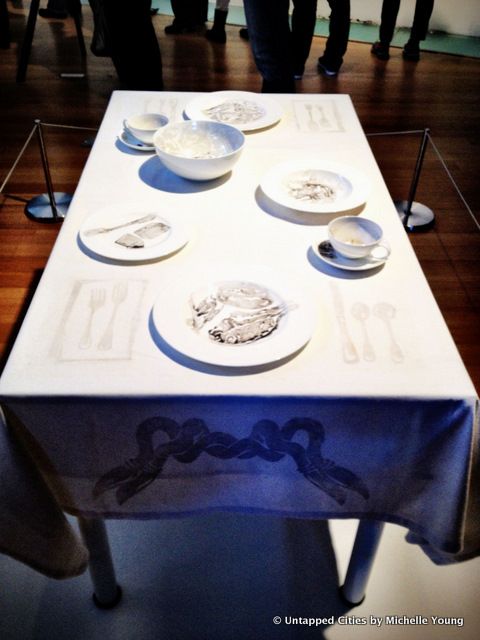 And as proven by one precocious seven year old, a child’s understanding of the conceptual motives behind modern art should not be overlooked or dismissed. She picked up on a key theoretical distinction in “Dinner for Two in One Month of Smog” by Kim Abeles (pictured below) that the very knowledgable tour guide didn’t seem to expect or understand in the girl’s comments.