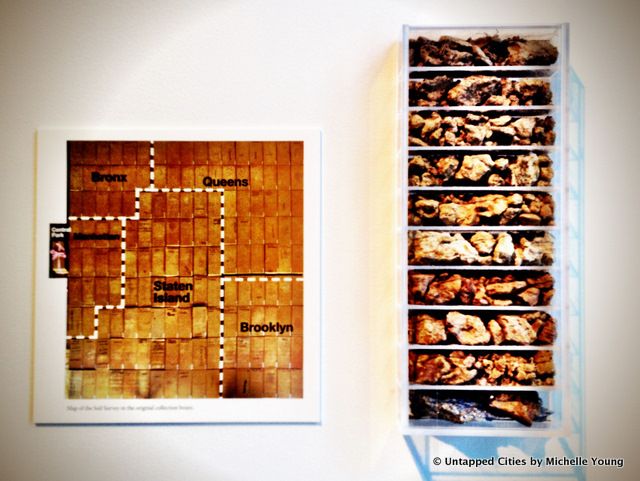 New York City has a wide range of soil types, a green rocky serpentine soil unique to Staten Island, a sandy soil in Brooklyn and Staten Island as a result of dredging, ash from the deposition of coal burning furnaces a hundred years ago. The soil sample Central Park (shown above) has ten distinct horizons from topsoil to schist bedrock.