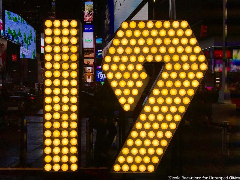 The two numerals each stand seven feet tall and are covered in lights. The pieces were brought into the plaza at Times Square on Wednesday evening by workers from Landmark Sign and Electric Maintenance, the company that fabricates and installs the signs every year.