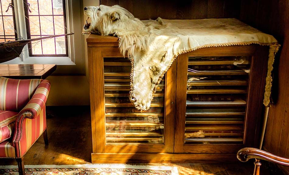 The Explorers Club is a particularly unique location to visit because of its vast collections, which include rooms of taxidermy. Walk beneath a growling polar bear, or sit between giant elephant tusks, and take in the size of blue whale’s penis. Animal heads rest atop a collection of Napoleon’s maps from his Egypt expedition. In total, The Explorers Club Research Collections contain approximately 14,000 volumes (1400 of which comprise the Rare Book Collection), 550 linear feet of archives and manuscripts, 1,000 artifacts, 3,500 maps, and 500 films and videos housed throughout Club Headquarters. The Explorers Club has also been a popular film location shoot seen in television shows like Billions