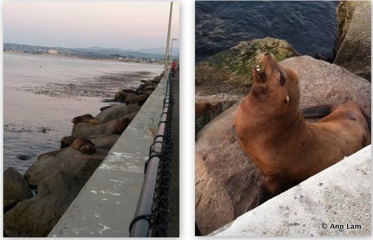 A Coast Guard Pier juts out from Fishermans Shoreline Park and into Monterey Bay. On a whim we started walking along the pier, admiring the boats and the twinkling city lights across the bay. A resonant bark to my left broke our peaceful reverie. I ran to look over the railings of the pier and was surprised to discover that my fellow pedestrians and I weren’t the only ones enjoying the evening: