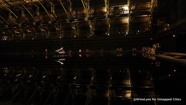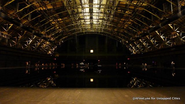 We enhanced the lighting on our first two photos to allow you to see the interior installation space. But when you enter the 55,000 square feet of Drill Hall, it is so dimly lit that a minute to adjust your eyes is quite necessary, since you will find the reflection of the ceiling in the pond a bit disorienting. These two photos (up and down) are more in line with the true lighting. At the far end, closer to the pianos, there is broad board seating on three sides–a very welcoming place to sit and yes, reflect. There were quite a few people doing just that while we were there.