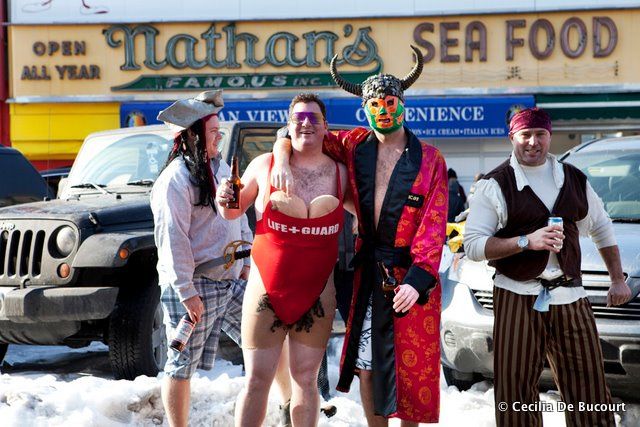 It was amazing. I woke up still a bit drunk of course from New Years Eve. To tell you the truth, I wasn’t excited so much for New Years Eve as I was for the Dip. I met up with my friend Don at the Q train station to head down there. He was dressed up as a polar bear and sewed the costume himself. I donned my viking helmet and a hoola skirt. It was such a gorgeous, sunny morning, mid-40s. Got off the Q train at Stillwell Avenue and ran into first timers who came up to us, b/c it was clear from our attire that we were there for the swim, and they were asking Don questions about whether there was a changing room, etc., and whether it was going to be a “disappointment” since it was so sunny and mild out. The answer was “no,” it was going to be awesome.