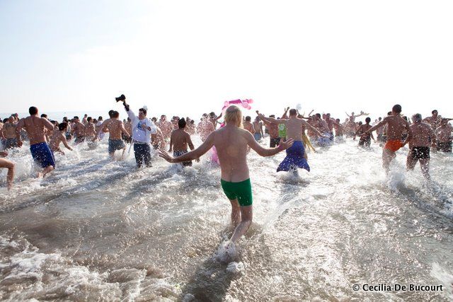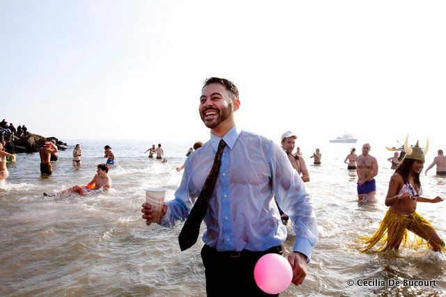 The initial dip was shocking. The hangover was immediately gone. I just remember screaming, maybe squealing is more like it, and then laughing, as I saw all these people splashing around and wide eyes everywhere in the water. So many wide eyes and gaping/smiling mouths. Lots of hooting/wooting/screaming/laughing. Lots of high-fiving random strangers in the water and leaping around. Before I dipped my head under the water, I took off my Viking helmet and used it as a bucket to dump water on myself. That was pretty invigorating. Chantel was so amazing running into the water with her pink balloons and pink parasol. Her boyfriend looked hilarious with his office attire and paper coffee cup in the ocean and his wet buttoned down shirt clinging to his skin.