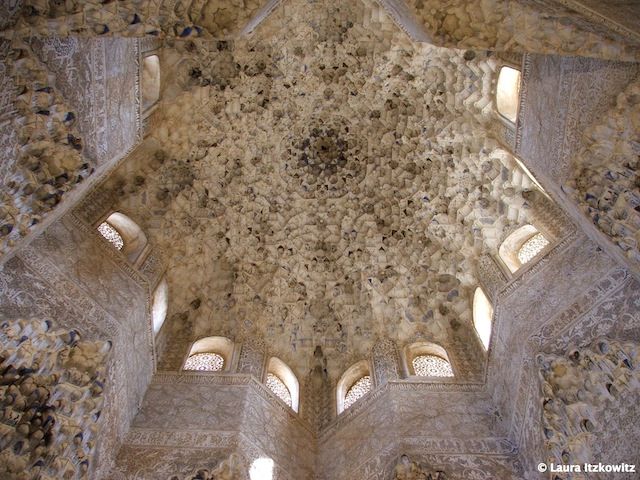 To get to the Alhambra, you have to climb up a large hill, but at the top you will be amply rewarded with incredible views of the city below. The white buildings with their terra cotta rooftops stretch outwards for miles and the air seems perfumed with exotic flowers. As soon as you cross the large arched threshold, you’ll realize that this is no ordinary palace. The Alhambra might be even grander than Versailles. You’ll be enchanted by the immense spaces, domed ceilings carved with Arab motifs, traces of centuries-old blue paint and intricate tiles. Islam prohibits the depiction of figures, so many of the carvings are inscriptions and Arabic poems written by various poets of the court.