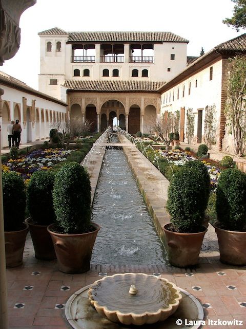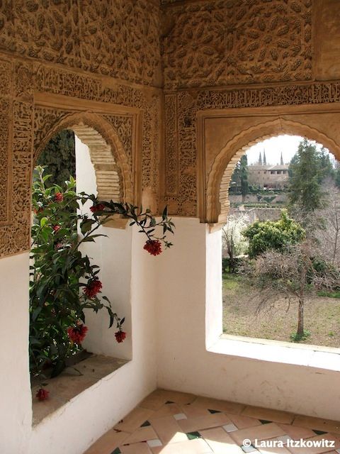 The Generalife gardens were almost more impressive than the palace–immense and well groomed with box hedges and water features. Some had trellises, others had pools or miniature waterfalls. On what seemed to be the edge of the grounds, there is a small open room with roses peeking in through the arches. It’s so quiet and peaceful. You can almost imagine what it might have been like in the 14th century, when kings and royalty came here to escape the demands of court life, like Marie Antoinette used to escape to her hamlet on the grounds of Versailles.