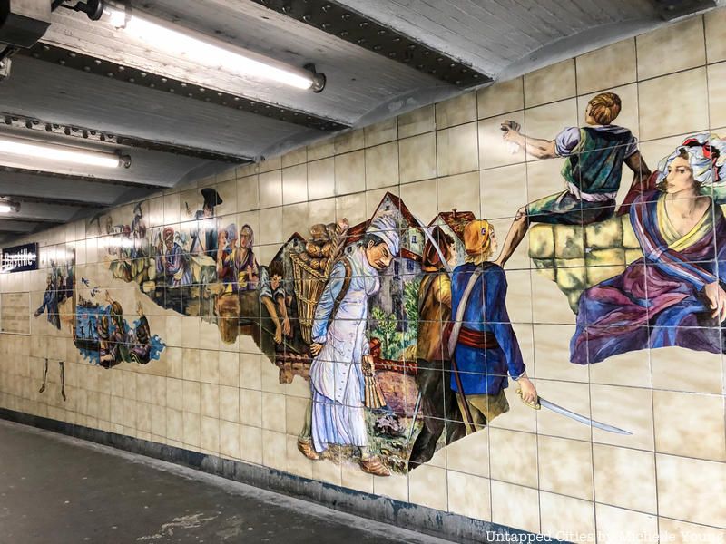 The Louvre is arguably one of the most popular attractions in Paris thanks to its vast collection of art works. Welcoming over 9 million visitors a year, it’s not surprising then that the Paris underground had to reflect the style and stature of this renowned museum. Built in 1990 at the same time as the new glass pyramid, the Louvre-Rivoli metro station is lined with replica art works to echo the pieces within the museum itself. Although this station no longer provides access to the museum itself, visitors passing through on Paris transport can still admire the uniquely curated platforms. Palais Royal-Musee du Louvre on the other hand is the Louvre Museum’s main metro station now, which is another must-see on your metro art tour. The unique Place Colette entrance is made from multi-coloured glass baubles and well worth a look.