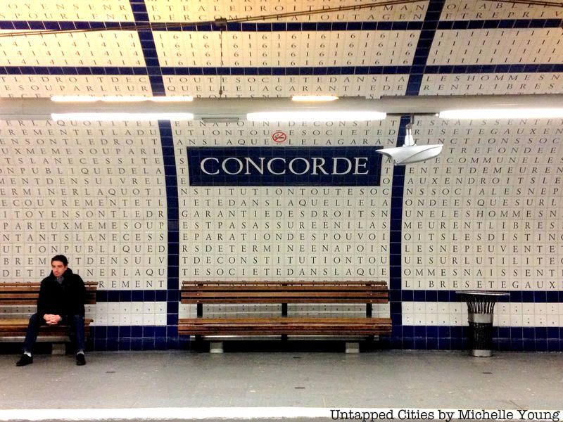 Concorde is one of the big interchanging stations in the Paris underground, linking lines 1, 8 and 12. It’s the main station to head towards if you’re planning on visiting the Orangerie Museum or walking up the Champs Elysées. Opened in 1990, it is one of the most recognisable stations in Paris thanks to the walls of the line 12 platform. The artistic genius behind the décor was artist Françoise Schein who covered the tunnel with lettered tiles all spelling out the 1789 Déclaration des Droits de l’Homme et du Citoyen. Trying to spot as many words as possible before the train pulls in is a wonderful way to pass the time! Did you know Ezra Pound’s 1912 poem In a Station in the Metro was inspired by this Concorde station, as well?\