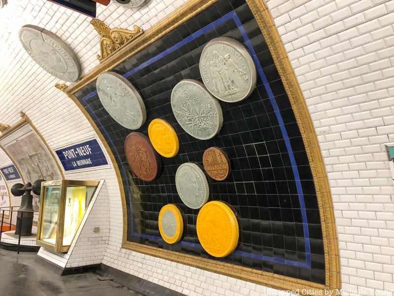 Pont Neuf is ironically the oldest bridge in Paris, although its name ‘new’ suggests otherwise. Built in 1607 it’s one of Paris’ most popular landmarks and favoured by visitors taking a romantic walk across the River Seine to the Île de la Cité to visit the Notre Dame and Sainte-Chapelle. The theme of the Pont Neuf Paris underground station represents the Monnaie de Paris (Paris Mint) just around the corner. You’ll see along the walls of the platforms are large replicas of French coins, as well as display cabinets and scales for weighing money.