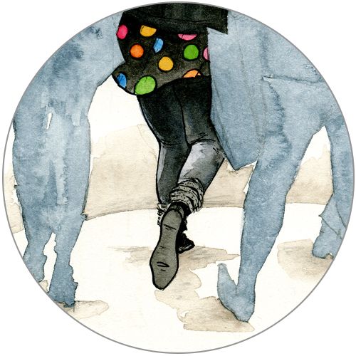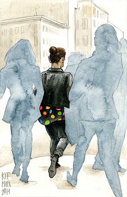 You quicken your pace, hoping to catch up with your target, who is weaving through the crowd like some kind of slippery, fashionable eel. The waves part—a miracle! Moses would be proud! For a brief second there she is, approaching the crosswalk. You take a mental snapshot of colored dots fluttering below a leather jacket, salt-and-pepper socks bunching above black ankle boots. Wait, are they legwarmers? But the “walk” sign flashes, the human flood resumes, and she disappears from your sight. The mystery will remain unsolved.