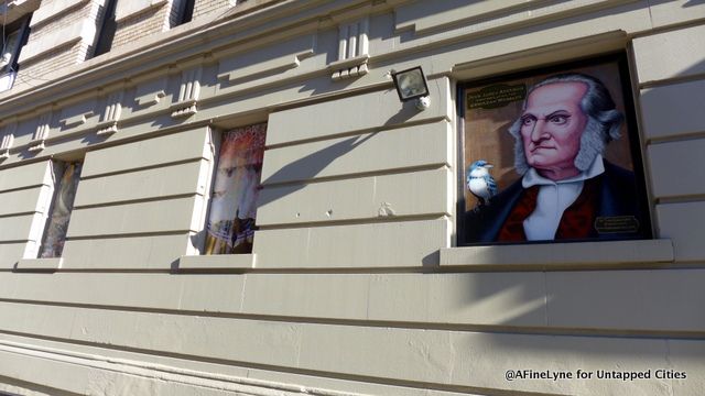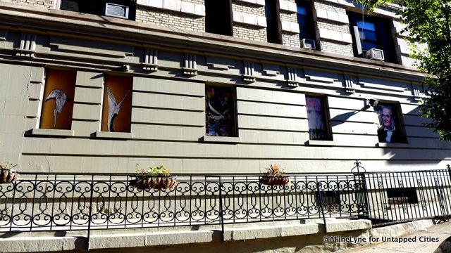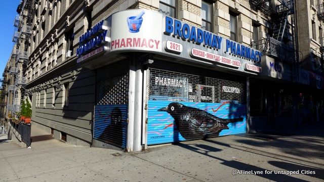 Taylor McKimens painted the mural Rusty Blackbird, which wraps around the corner on 149th Street and Broadway. Continuing on 149th Street, you will find five windows filled with colorful and significant images painted by four different artists.