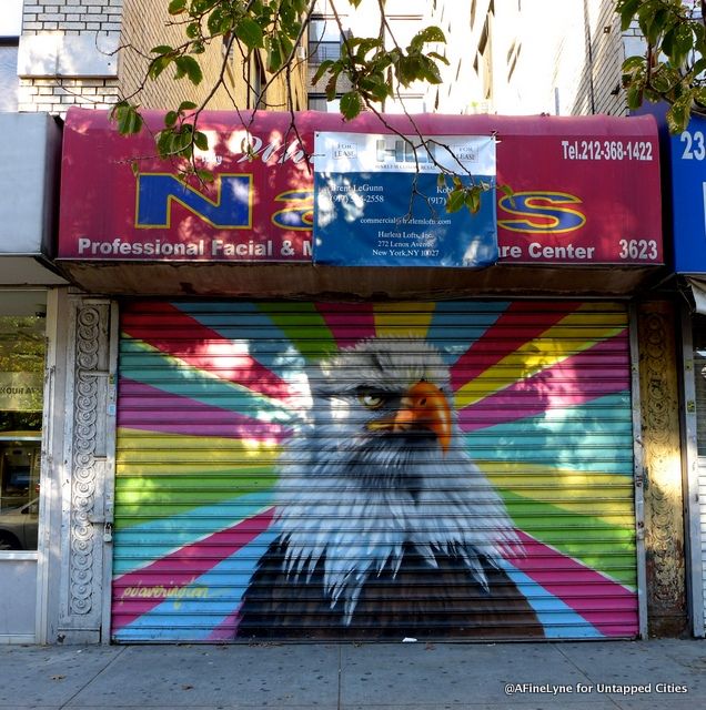 Back onto Broadway, between 149th and 150th Streets, you will find the mural Black Vulture by artist Marthalicia Matarrita, located on a half-gate (above). The Bald Eagle (below) by artist Peter Daverington can be found on the building next door, located at 3623 Broadway.