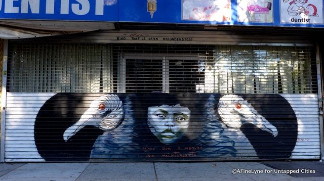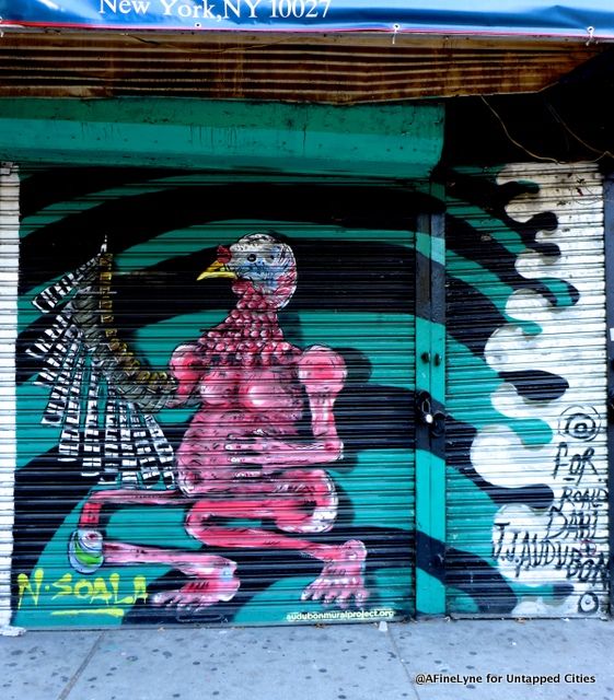 Above and below, the mural Wild Turkey painted by artist N. Soala, is based on a short story by Roald Dahl, named The Magic Finger recounting the effect we are having on our planet. The mural, located at 3629 Broadway, sits next door to the gallery that founded The Audubon Mural Project, Gitler & ___ Gallery.