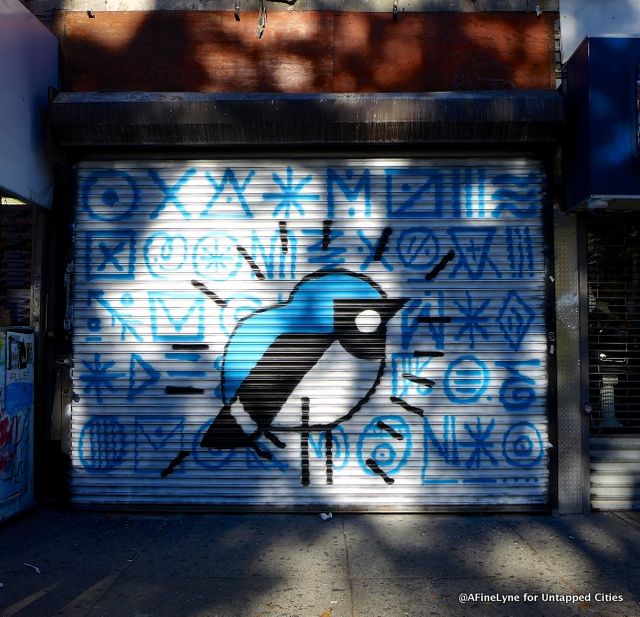 The Black-throated Blue Warbler was painted by artist Richard Alexander Caraballo, also known as minusbaby. Best known as a pixel-artist, he is also recognized as a lo-fi electronic musician. Black-throated Blue Warbler can be found at 3637 Broadway between 149th and 150th Streets.