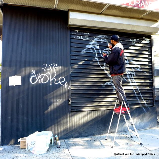 While we were there, Avi Gitler took us to watch the well-known artist, Andre Trenier, painting his second mural around the corner from his first, on 150th Street and Broadway. When asked how long it might take and he said it had to be done by the time the restaurant opened. He had two hours.