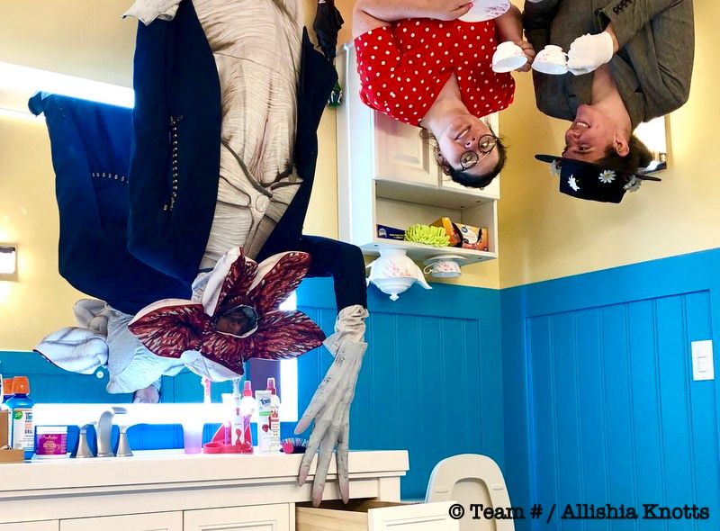 After getting all of the costumes together, Christine realized that she had to be in the photo along with her husband as the Demogorgon and Amanda as Mary Poppins. Christine said, “I was covered in dirt and sweat in my ratty jeans from building a giant sock monkey at the park earlier that day and hadn’t brought a change of clothes. Luckily, Allishia lived nearby and offered to let me borrow a dress, so we ran to her place and quickly changed.”