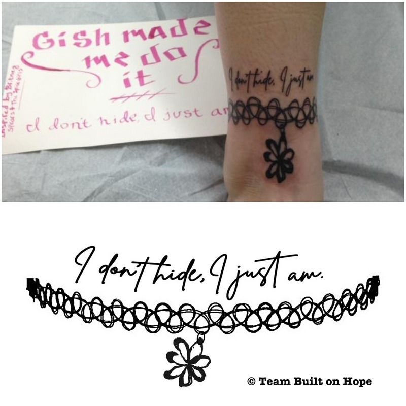 The tattoo had to feature a Britney Spears and TSG mashup quote. The first half was taken from TSG lyric, “You gotta show what you feel, don’t hide.” The second half came from a Britney Spears interview where she said, “I just am.” The quote, of course, wraps around a ’90s choker design and the flower is from Britney’s first CD.