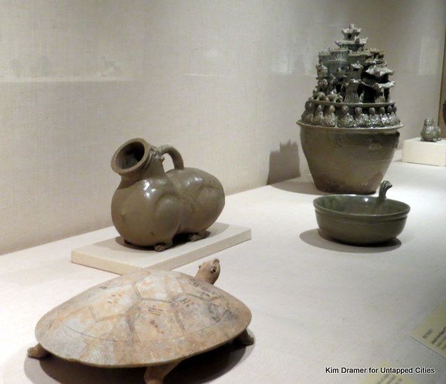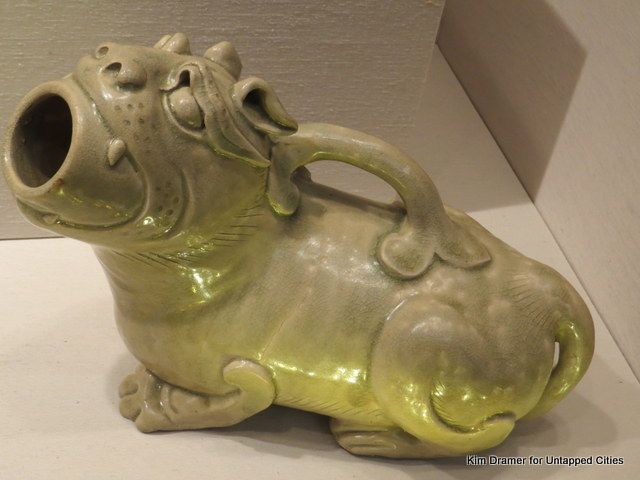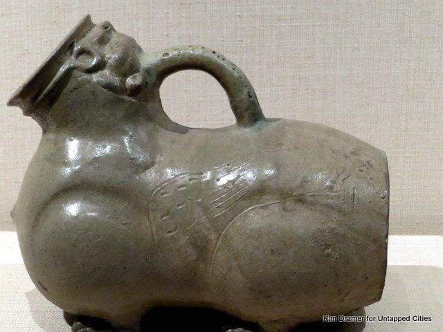 Can it be a coincidence that the curators of the Chinese collection left an additional huzi on display on the Met’s Great Hall Balcony Bar? This splendid specimen (pun intended) from the 6th century, features the prized celadon glaze. The museum chat card describes it as a “fanciful vessel.” Indeed.