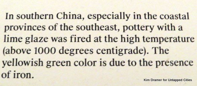 In the vitrine directly opposite the restroom entrance is a display of ancient pottery. The chat card explains that these early examples of high-fire, glazed ceramics are notable for their lime glaze. Further, “the yellowish green color” is due to the presence of iron.” Surely the curators don’t mean to link these early ceramics with other things exhibiting the same “yellowish green” hues? Or do they?