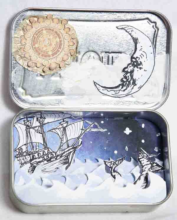 Christopher Grant originally began making the intricate artworks for his girlfriend, Grace, so she could carry her dreams around in her pocket. He said, “It all started one morning when Grace recounted this crazy dream that she had just had where it was simultaneously day and night and there was an old ship at sea with three whales splashing their tales in the distance.