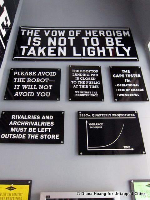 But beyond the basics- you definitely want to check this place out. If you’re into design, the whole store is filled with examples of coherent, beautiful graphic design. The products, and signs have a kind of tongue-in-cheek playfulness that will definitely bring a smirk or smile to your face. If you love the written word, 826 has shelves of great essay and short story collections written by students of 826, the staff of McSweeney’s, contributors to the Believer and other great modern writers linked to 826’s founder Dave Eggers. If you don’t need any superhero supplies, you can play with several of the stores interactive exhibits: try on a cape and snap a pic for your friends at the store’s cape testing chamber, if you’re feeling like a villain, the store has a cure! A devillainizing chamber that asks you a series of questions, determines your type of villain and takes cares of the problem. Even purchasing something small is an experience, as store rules require you to recite the vow of heroism with every purchase.