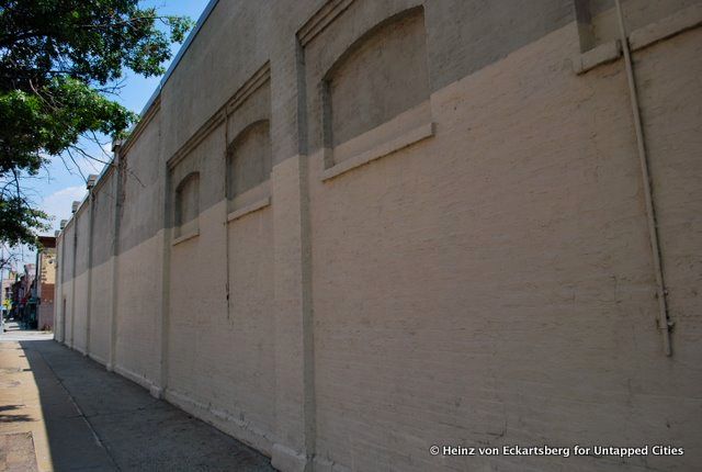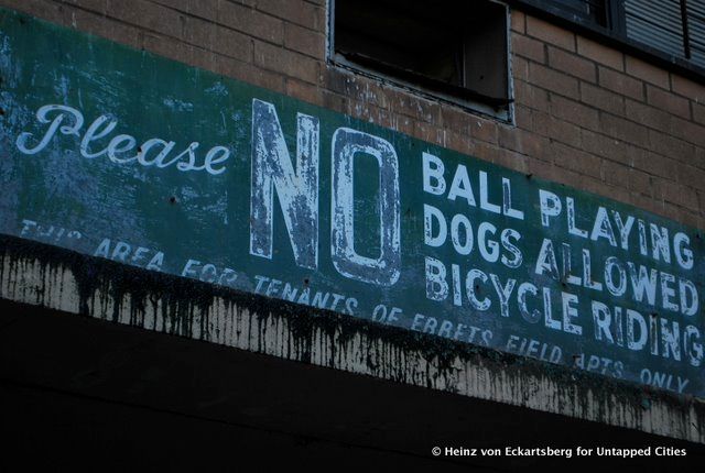 The walls below in Gowanus, though previously thought to be from Washington Park, where the Dodgers played before moving to Ebbets Field in 1913, is actually from the park built for the Brooklyn Tip-Tops in 1914. A commenter below notes that the Tip-Tops were “a short-lived Federal League team named by the owner after a popular brand of bread.”