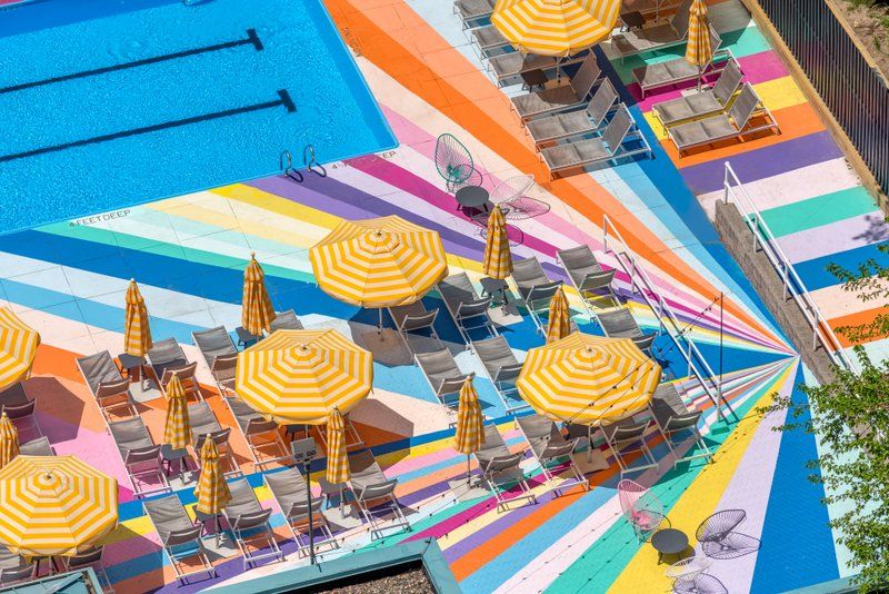 Whimsical, vibrant colors draped across a New York City pool deck on a hot day are nothing but a blissful sight. For the fifth year in a row, Citi Habitats in partnership with K&Co and Pliskin Architecture have collaborated to resurrect the captivating Pop-Up Pool Party at Roosevelt Island‘s Manhattan Park rental apartments. Each summer since 2015, a new artist has been commissioned to transform the pool deck into an alluring and mesmerizing work of art that lasts only for each pool season. Previous artists such as HOT TEA, Andrew Farris, Gregg Emery, and Technodrome1 have each incorporated unique elements to the project but maintained a bright summertime feel. The design of the installation spans across the entirety of the pool deck allowing spectators to not only admire but also feel immersed within the art as they walk on top of it.