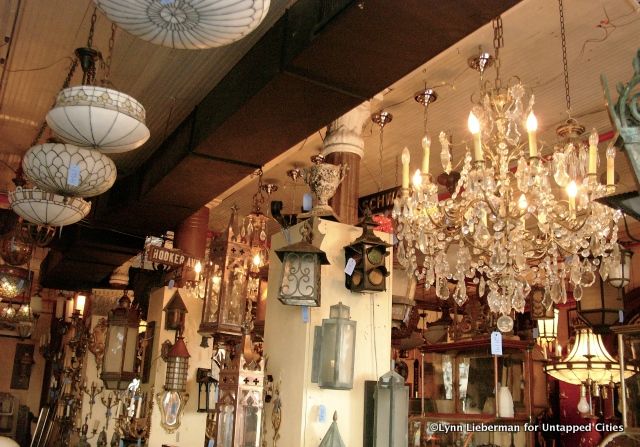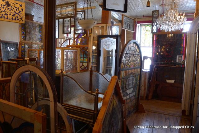 The first floor houses all kinds of light fixtures from chandeliers to candelabra, hardware, and display cases filled with smaller treasurers. The second floor is filled with stained and leaded glass windows, ceilings and doors. The third floor is dedicated to doors and just a small part of their fireplace mantel collection. The fourth floor houses plumbing fixtures, mirrors and the balance of their fireplace mantels that had been housed in a building across the street until the City took the building through eminent domain.