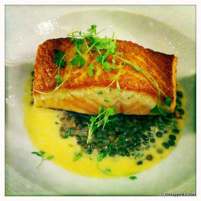 Plancha seared salmon with fresh green lentils and dijon beurre blanc: