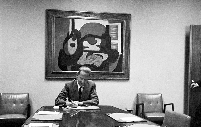 Mr. Dag Hammarskjöld, Secretary – General of the United Nations, photographed in his private conference room, on the 38th floor of the Secretariat building. Hanging on the wall behind Mr. Hammarskjöld, is “Still Life with Cake,” a painting by Pablo Picasso which was lent to the United Nations by New York’s Museum of Modern Art. This painting was done in 1923, when the artist was in his late cubist period. UN Photo/MB.