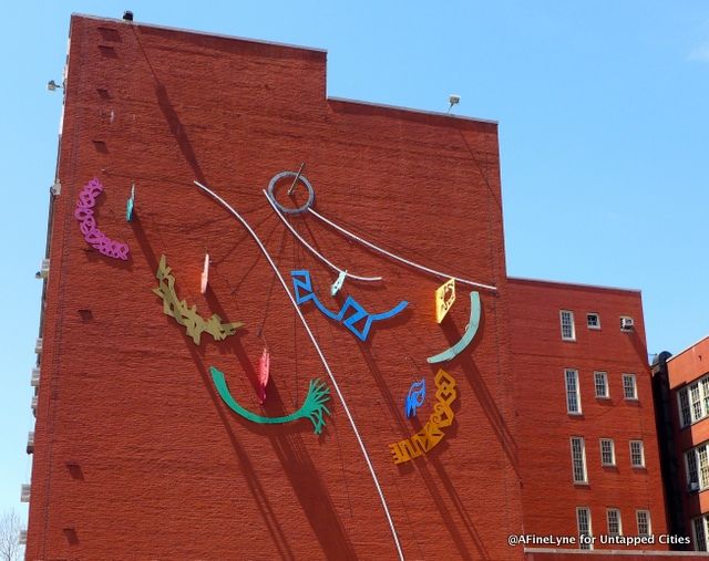 The Helio-Chronometer was a collaboration between CITYarts Marina Gutierrez and architect James Comejo. This solar clock spans 100 feet of a wall of a school facing Lexington Avenue. This sundial contains elements from Mexican cut paper arts, a sampled Hip Hop local street graphic, a Chinese “lace paper” rooster with palm frond, a pre-Columbian textile snake, an African arc of Ndinkra symbols with Egyptian eye and a Coquil, whose shadow hovers over an arc of sugar cane.