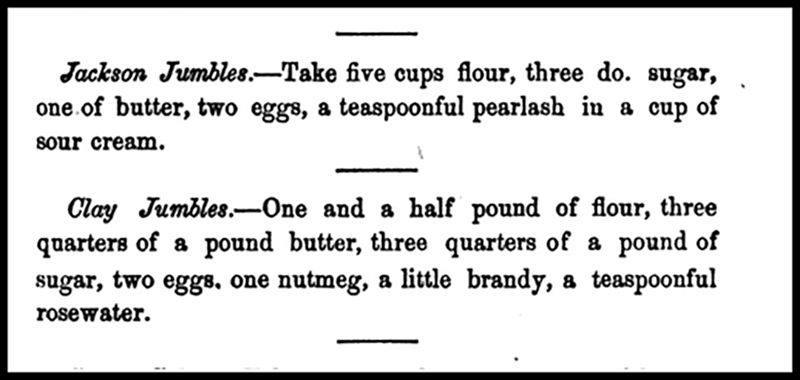 According to Arendt, food was not only used to cultivate a sense of national solidarity in the 1800’s, but also to reflect political divisions as women utilized desserts to indicate particular partisan preferences. The election of 1832, for instance, pitted democrat Andrew Jackson against national republican Henry Clay, giving rise to what she calls the “dueling Jumble recipes (Jackson Jumbles and Clay Jumbles).”