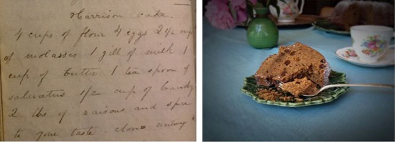 Miscellaneous recipe for Harrison Cake, Manuscripts and Archives Division, The New York Public Library (left); a slice of William Henry Harrison Cake (right). Images via Emily J. Arendt