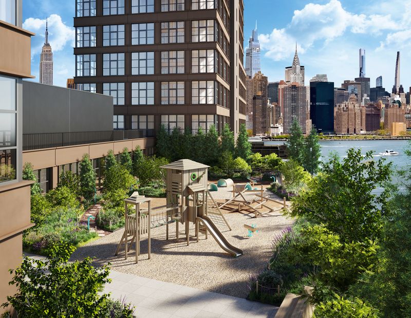 Amenity spaces at The Huron cover 30,000 square feet. This includes an elevated, 8,000+ square foot outdoor park and playground centered around a treehouse which can only be accessed from within the building. Other amenities include a 50-foot-long saltwater pool that faces the Manhattan shoreline, a beautiful co-working area, The Nook, a casual hangout outfitted with table games, state-of-the-art TV, and comfy seating, and two communal rooftops with space for lounging, picnics, barbecuing, and outdoor movies. Sixty-seven residences have their own private outdoor space, which encompasses a total of 23,000 square feet.