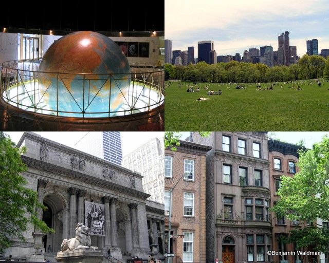 The different types of NYC landmarks: The Daily News Building (Interior Landmark), Central Park (Scenic Landmark), New York Public Library, Main Branch, (Individual Landmark), and Brooklyn Heights Streetscape (Historic District)