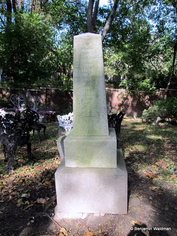 A cenotaph belonging to Abraham Riker is one of the most important monuments in the cemetery. As it states on the stone, Captain Riker “Served his country nobly in the war of the Revolution and died at Valley Forge May 7, 1778, in his 38th year.”